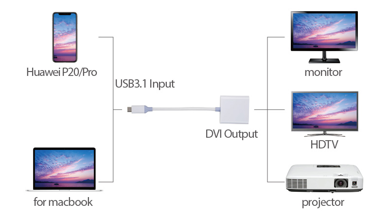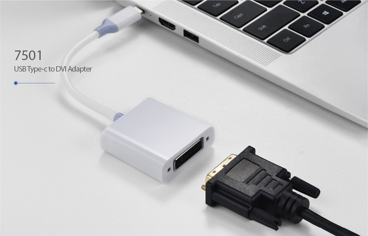 USB TYPE C to DVI adapter connects a computer host with a USB Type-C port to a monitor or projector with DVI input;